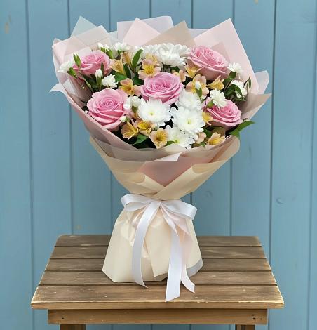 Утонченный, чувственный букет, который вы без сомнения можете преподнести девушке или девочке, как по случаю, так и просто в качестве знака внимания. Каждый цветок в композиции по своему привлекателен и нежен и удачно дополняет следующий, это и бархатистые розы, и гвоздики и пленительные альстромерии.